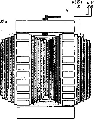 圖3-2是消弧線圈的鐵心和線卷的草圖,其線卷一般系采用層式結(jié)構(gòu),這對(duì)于線卷的絕緣是有利的。線卷的第一層1和第二層2能夠斷開,亦能串接或反接。在鐵軛上裝有測(cè)量線卷,由于主線卷的匝數(shù)要改變,所以測(cè)量線卷也具有分接頭,以便得到合適的變比。